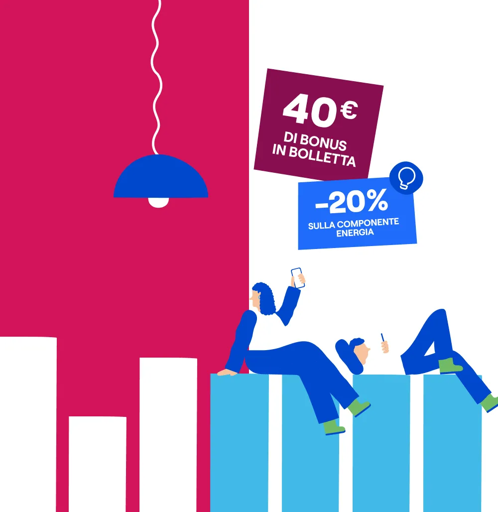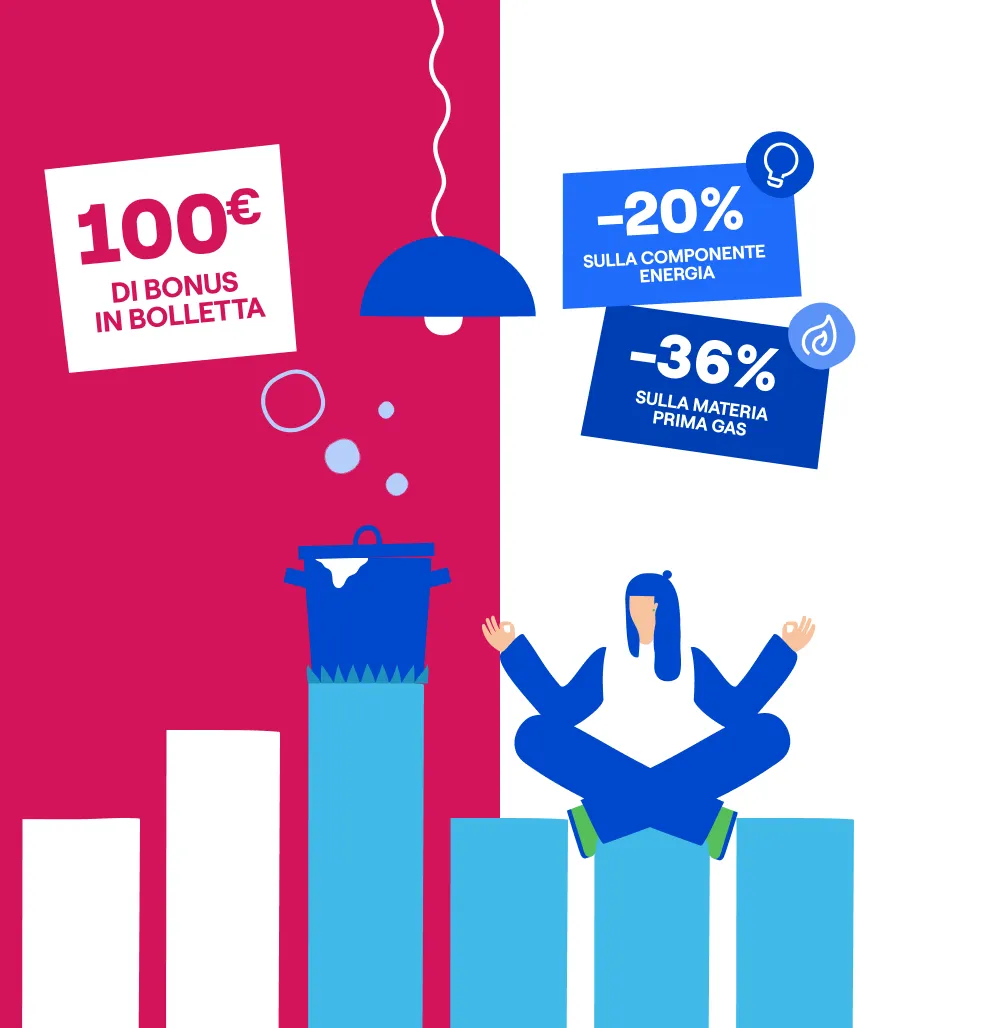 Il bonus di 100€ nelle bollette è erogato in quattro tranches direttamente nella prima, settima, tredicesima e diciannovesima bolletta. Condizioni economiche valide fino al 04/03/2026, salvo proroghe. Altre componenti di spesa come da CTE.
