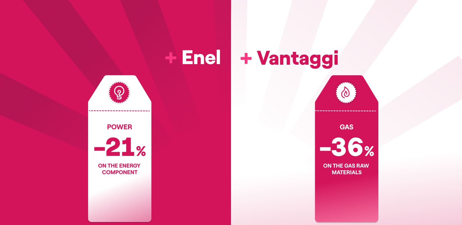 *The maximum 21% savings are calculated starting from the energy component price of the Enel Fix Luce offer (€0.162/kWh), as the sum of (i) - 18% when subscribing via the web channel (€0.132/kWh) and (ii) - 3% for customers who are already gas customers (€0.127/kWh). The maximum 36% savings are calculated starting from the natural gas raw material component price (€0.600/Smc), as the sum of (i) - 30% when subscribing via the web channel (€0.420/Smc) and (ii) - 6% for customers who are already power customers (€0.382/Smc).