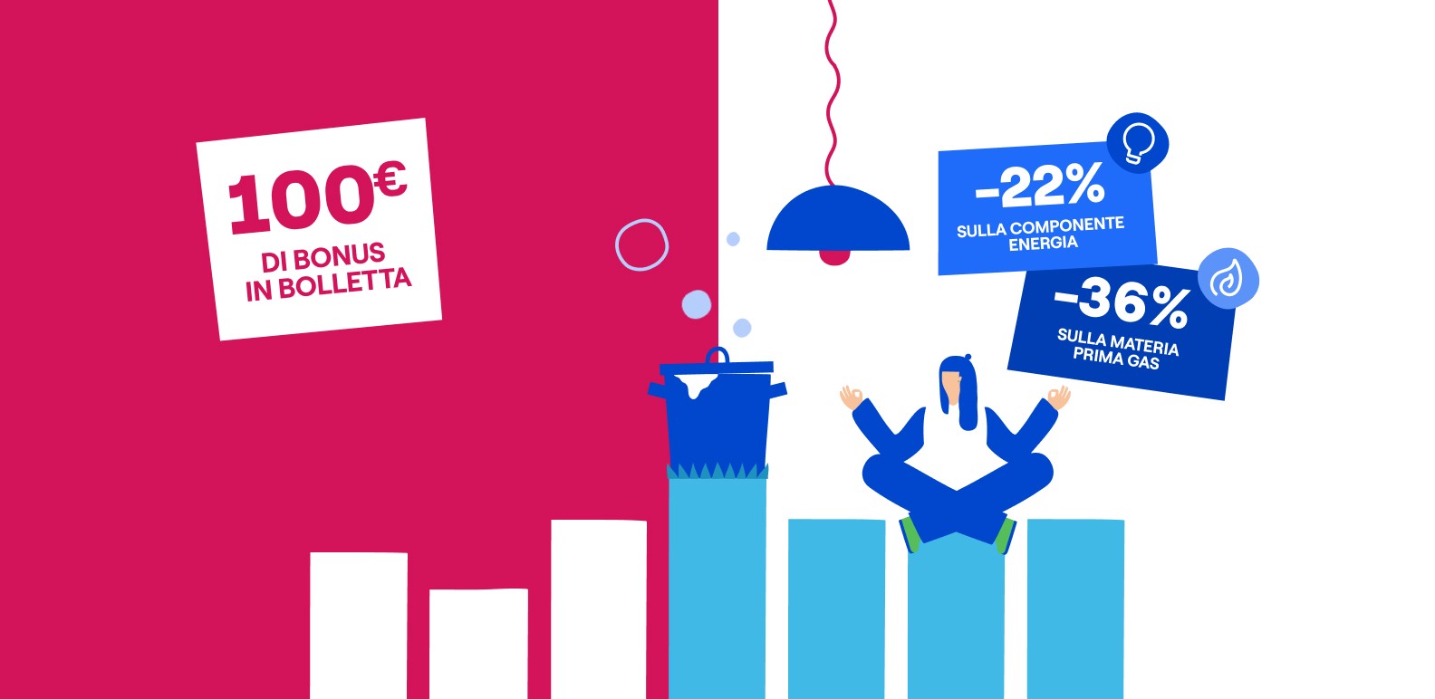 The €100 bonus on bills is applied in four installments, directly to the 1st, 7th, 13th, and 19th bills. Economic conditions valid until 31/03/2026, unless extended. Other cost components as per the technical and economic conditions (CTE).