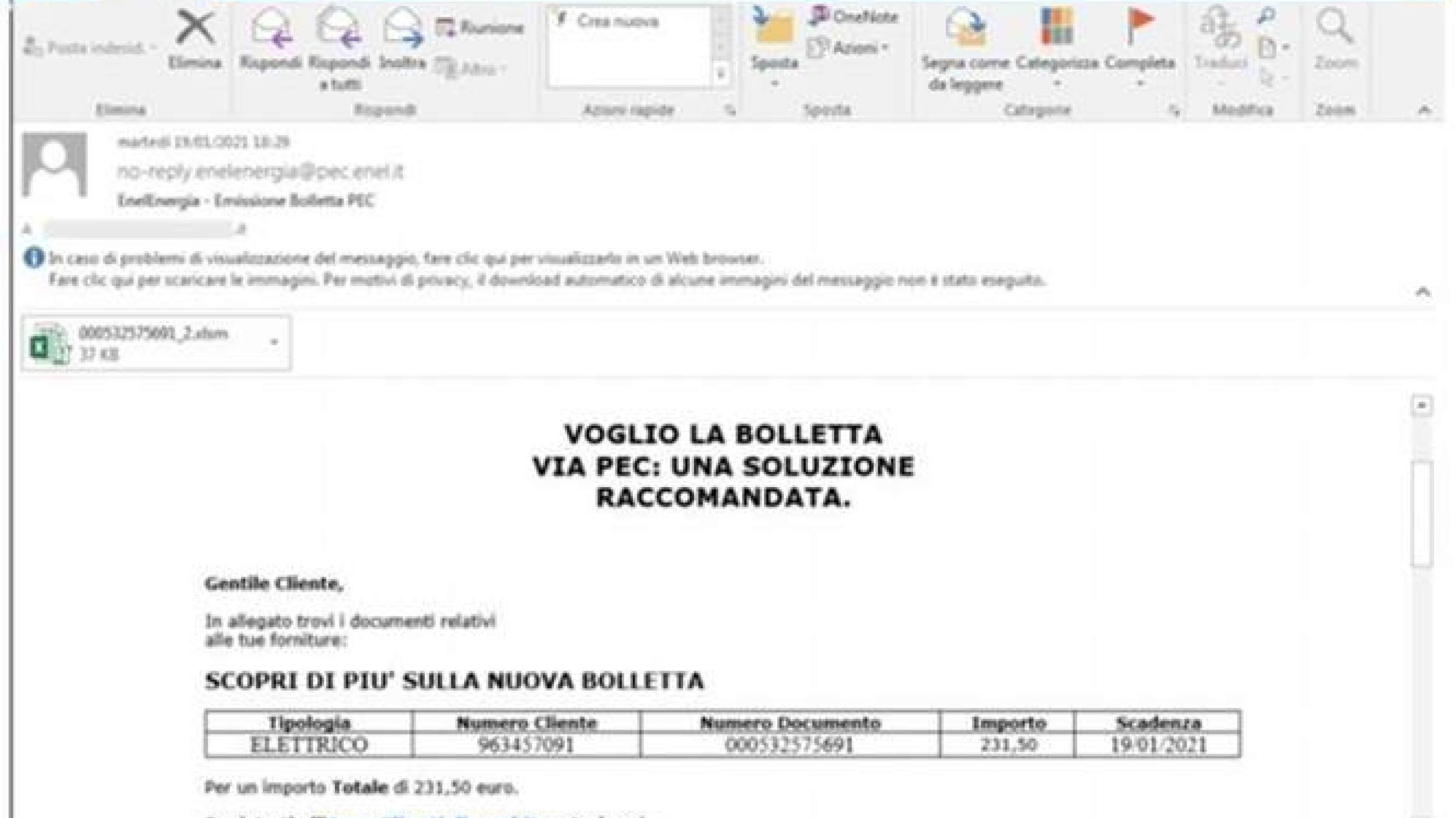 In questo caso si tratta di una e-mail dal contenuto ingannevole che sfrutta il brand Enel, di seguito l’esempio di email truffa, che riporta come oggetto “Enel Energia - >Emissione Bolletta PEC”.