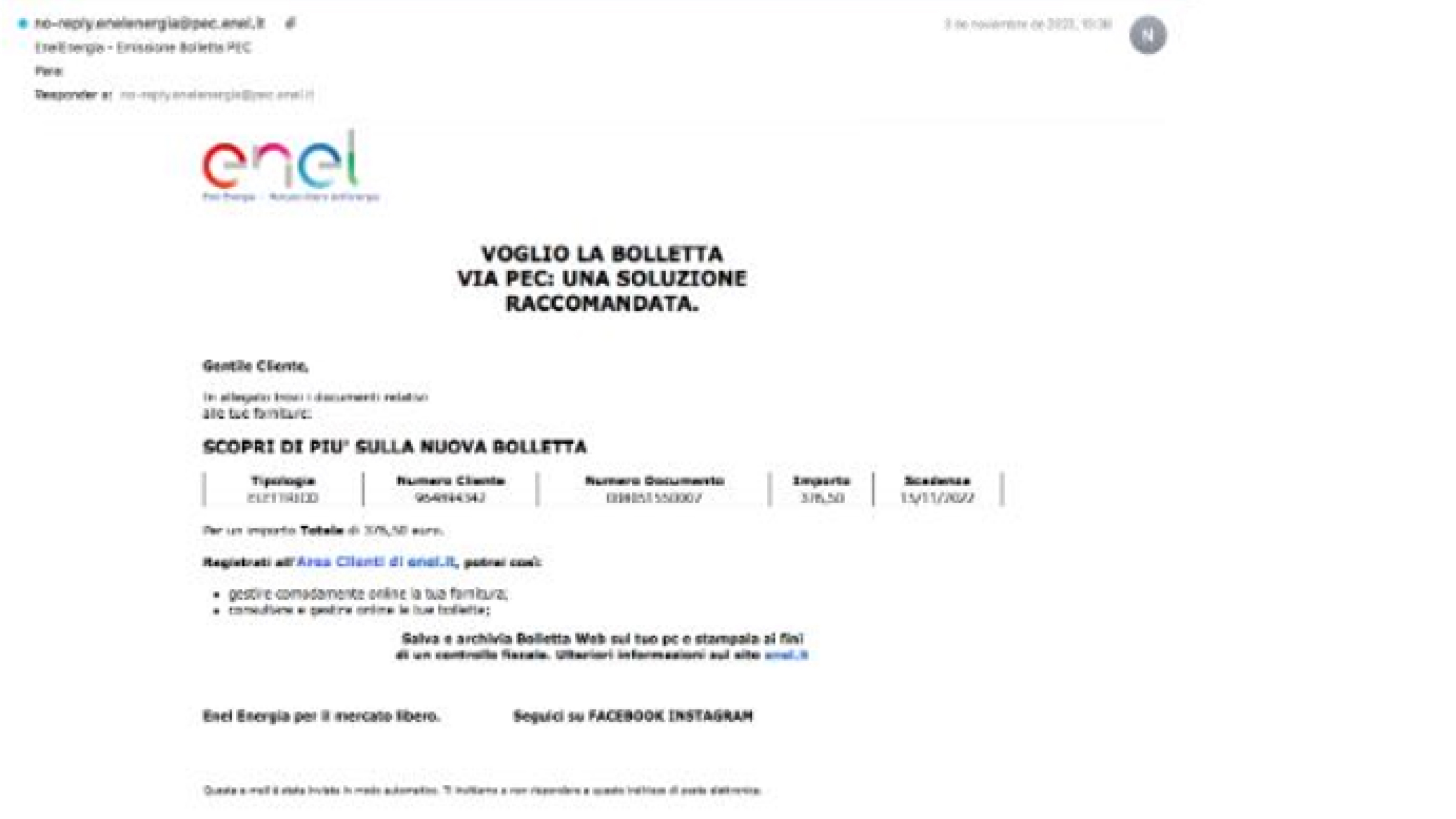 In questo caso si tratta di una e-mail dal contenuto ingannevole che sfrutta il brand Enel, di seguito l’esempio di email truffa, che riporta come oggetto “Enel Energia - >Emissione Bolletta PEC”.