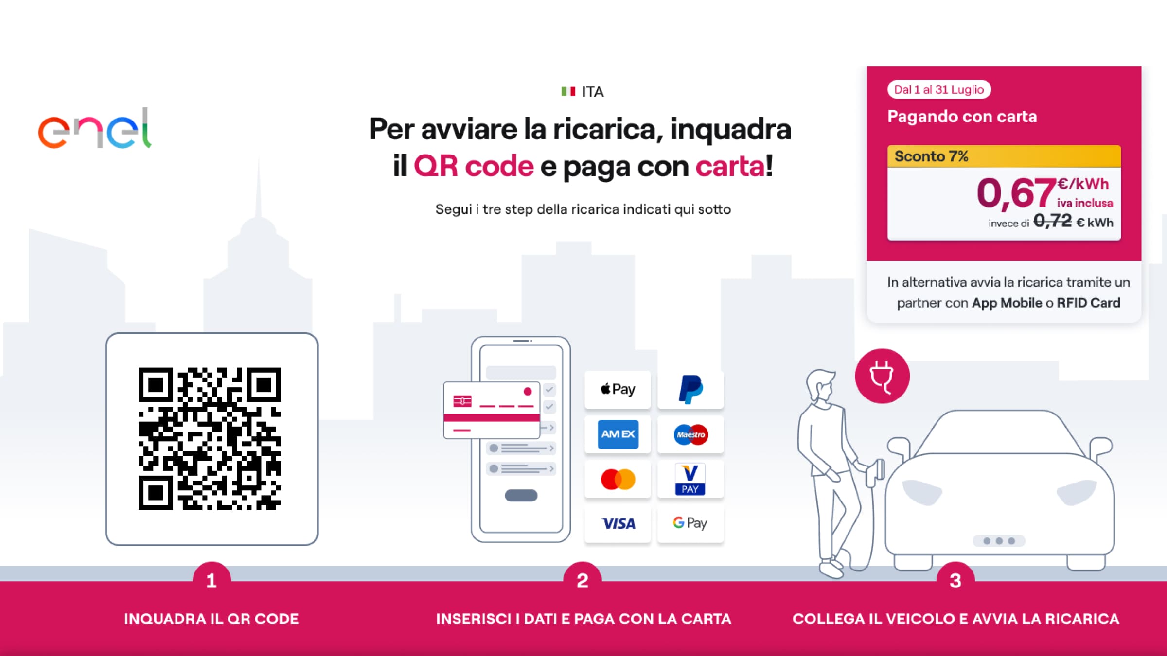 La tariffa è valida esclusivamente per pagamenti effettuati tramite POS fisico o virtuale, presso le infrastrutture di ricarica Enel X Way Italia dotate di schermo integrato.