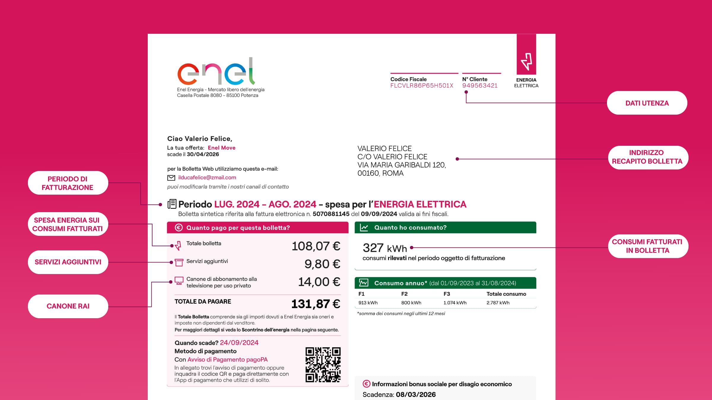 In questa sezione trovi due informazioni fondamentali: il codice fiscale e il numero cliente. Sono utili per identificarti nei nostri sistemi e accedere ai servizi Enel in modo semplice e veloce.
