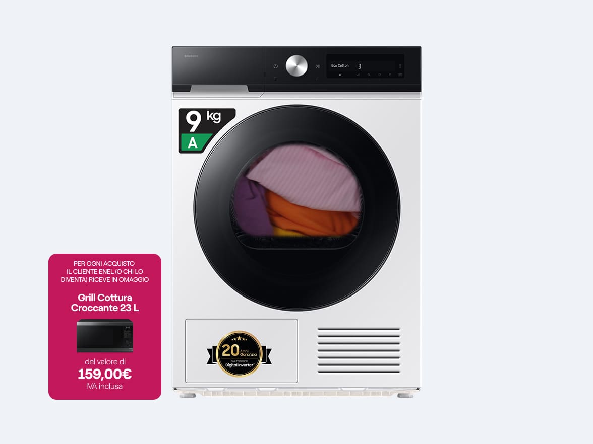 **Fino a 72 mesi ‐ prima rata a 60 giorni ‐ importo finanziabile da € 311,76 a € 1.823,76. Esempio Asciugatrice BESPOKE AI™ Quick Dry: € 911,76 (importo totale del credito) in 24 rate da € 40,93 ‐ TAN fisso 6,75% TAEG 6,93%. Il TAEG rappresenta il costo totale del credito espresso in percentuale annua e include: interessi, spesa mensile gestione pratica € 0; importo totale dovuto (importo totale del credito + costo totale del credito) €982,32. Messaggio pubblicitario con finalità promozionale. "Informazioni europee di base sul credito ai consumatori" (IEBCC) e copia del contratto disponibili nei punti vendita e canali abilitati. Salvo approvazione della finanziaria prescelta per cui Enel Energia opera quale intermediario del credito non in esclusiva per Agos, Fiditalia, Findomestic.