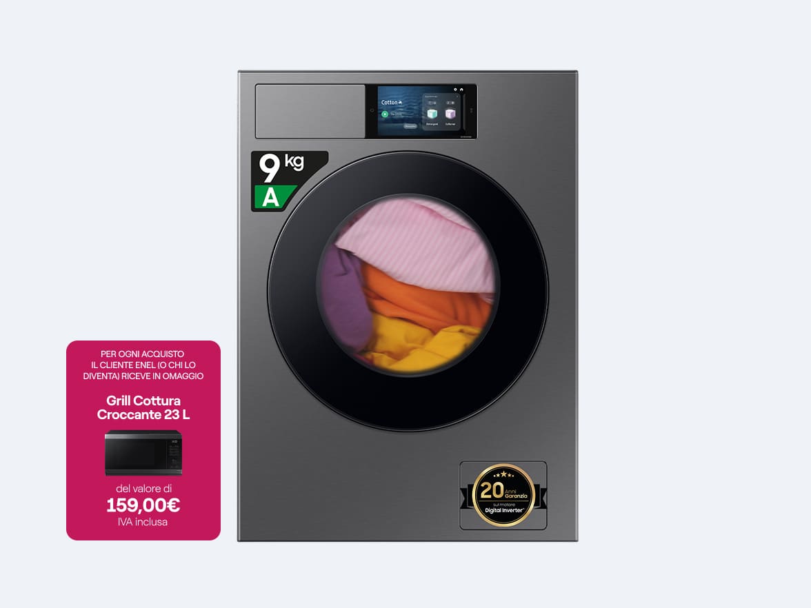 *Fino a 24 mesi - prima rata a 90 giorni dalla consegna – offerta valida dal 04/12/2025 al 26/01/2026. Esempio Samsung Lavatrice Bespoke AI Laundry – 1.031,70€ (importo totale del credito) in 24 rate da 42,99€ - TAN fisso 0,00% TAEG 0,00%. Il TAEG rappresenta il costo totale del credito espresso in percentuale annua - importo totale dovuto 1.031,70€. L'importo del finanziamento dipende dal prezzo del bene come concordato tra cliente ed Enel Energia in funzione di eventuali scontistiche applicate da Enel per l'adesione ad ulteriori offerte. Messaggio pubblicitario con finalità promozionale. "Informazioni europee di base sul credito ai consumatori" (IEBCC) e copia del contratto disponibili nei punti vendita e canali abilitati. Salvo approvazione della finanziaria prescelta per cui Enel Energia opera quale intermediario del credito non in esclusiva per Agos, Fiditalia, Findomestic.