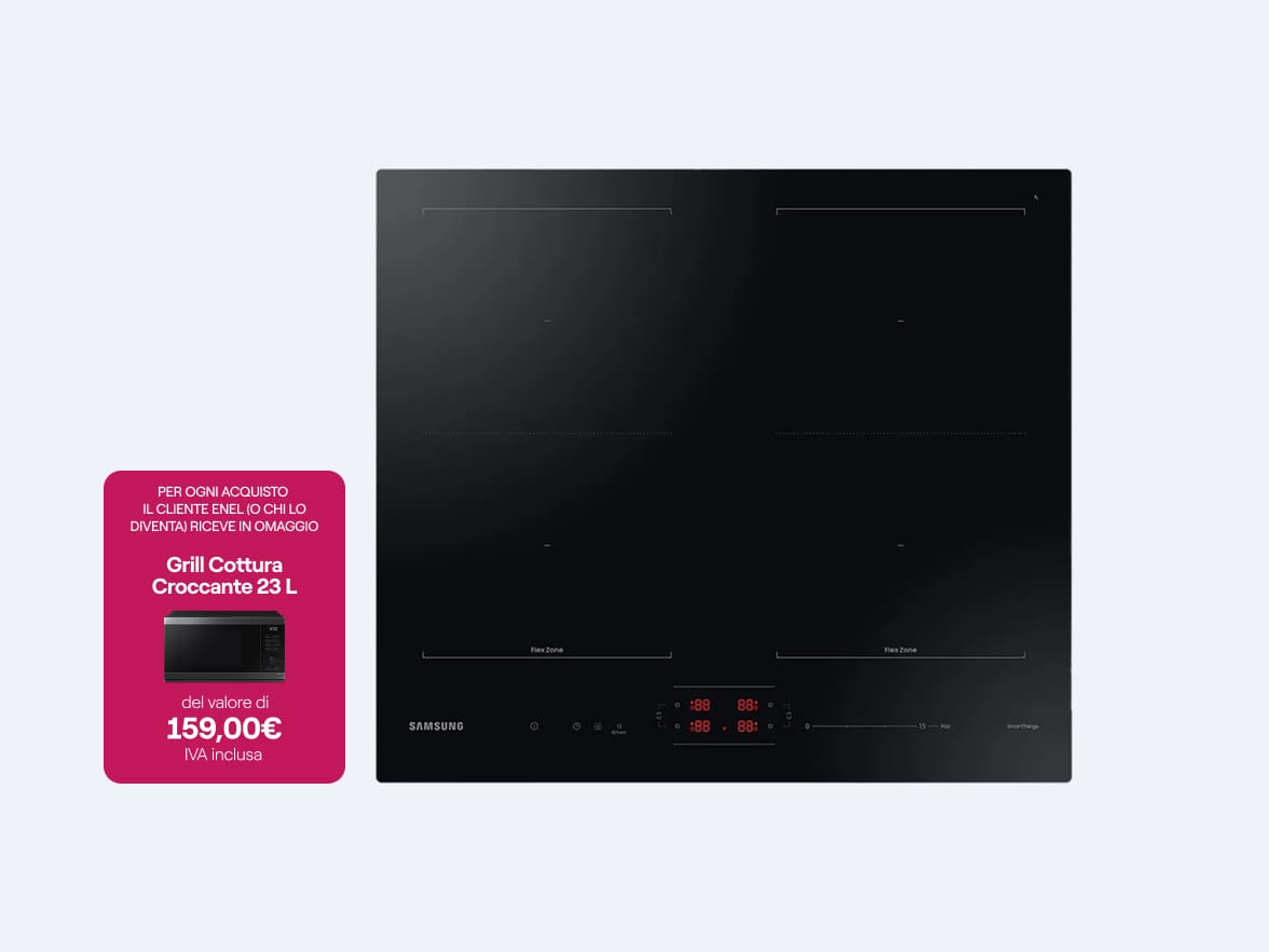 *Fino a 24 mesi - prima rata a 90 giorni dalla consegna – offerta valida dal 04/12/2025 al 26/01/2026. Esempio Samsung Piano a Induzione Slim Fit 60cm – 815,70€ (importo totale del credito) in 24 rate da 33,99€ - TAN fisso 0,00% TAEG 0,00%. Il TAEG rappresenta il costo totale del credito espresso in percentuale annua - importo totale dovuto 815,70€. L'importo del finanziamento dipende dal prezzo del bene come concordato tra cliente ed Enel Energia in funzione di eventuali scontistiche applicate da Enel per l'adesione ad ulteriori offerte. Messaggio pubblicitario con finalità promozionale. "Informazioni europee di base sul credito ai consumatori" (IEBCC) e copia del contratto disponibili nei punti vendita e canali abilitati. Salvo approvazione della finanziaria prescelta per cui Enel Energia opera quale intermediario del credito non in esclusiva per Agos, Fiditalia, Findomestic.