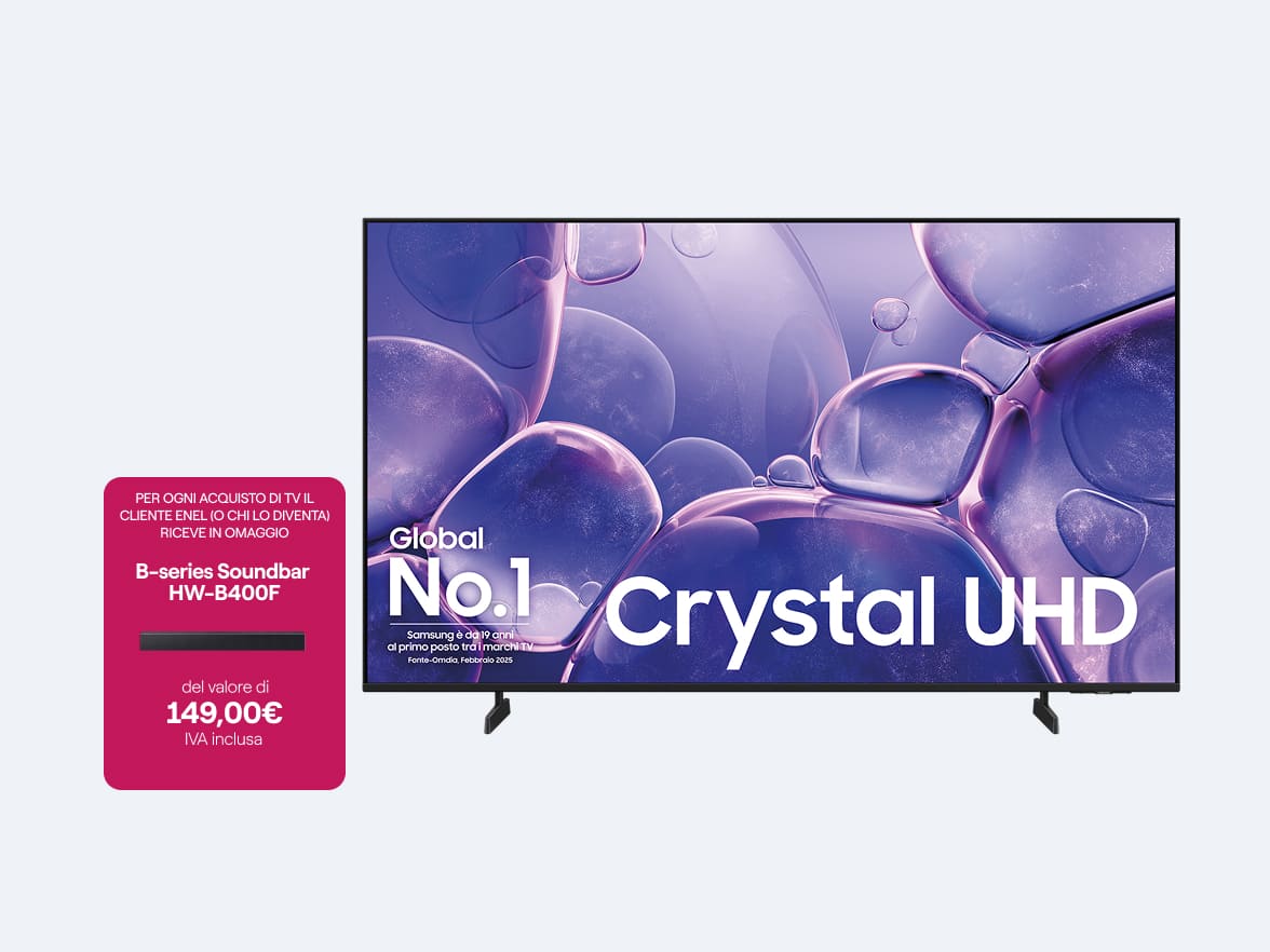 *24 mesi - prima rata a 90 giorni dalla consegna – offerta valida dal 04/12/2025 al 26/01/2026. Esempio SAMSUNG TV Crystal UHD 4K 55'' U8000F – 431,76€ (importo totale del credito) in 24 rate da 17,99€ - TAN fisso 0,00% TAEG 0,00%. Il TAEG rappresenta il costo totale del credito espresso in percentuale annua - importo totale dovuto 431,76€. L'importo del finanziamento dipende dal prezzo del bene come concordato tra cliente ed Enel Energia in funzione di eventuali scontistiche applicate da Enel per l'adesione ad ulteriori offerte. Messaggio pubblicitario con finalità promozionale. "Informazioni europee di base sul credito ai consumatori" (IEBCC) e copia del contratto disponibili nei punti vendita e canali abilitati. Salvo approvazione della finanziaria prescelta per cui Enel Energia opera quale intermediario del credito non in esclusiva per Agos, Fiditalia, Findomestic.