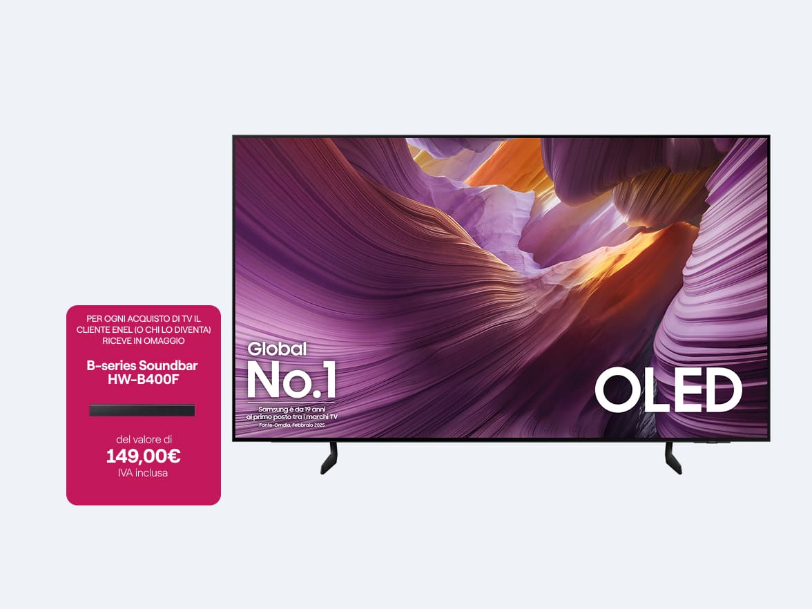 **Fino a 120 mesi ‐ prima rata a 60 ‐ importo finanziabile da € 311,76 a € 1.823,76. Esempio SAMSUNG TV OLED 4K 77" S85F: € 2.111,76 (importo totale del credito) in 24 rate da € 94,80 ‐ TAN fisso 6,75% TAEG 6,93%. Il TAEG rappresenta il costo totale del credito espresso in percentuale annua e include: interessi, spesa mensile gestione pratica € 0; importo totale dovuto (importo totale del credito + costo totale del credito) €2.275,20. Messaggio pubblicitario con finalità promozionale. "Informazioni europee di base sul credito ai consumatori" (IEBCC) e copia del contratto disponibili nei punti vendita e canali abilitati. Salvo approvazione della finanziaria prescelta per cui Enel Energia opera quale intermediario del credito non in esclusiva per Agos, Fiditalia, Findomestic.