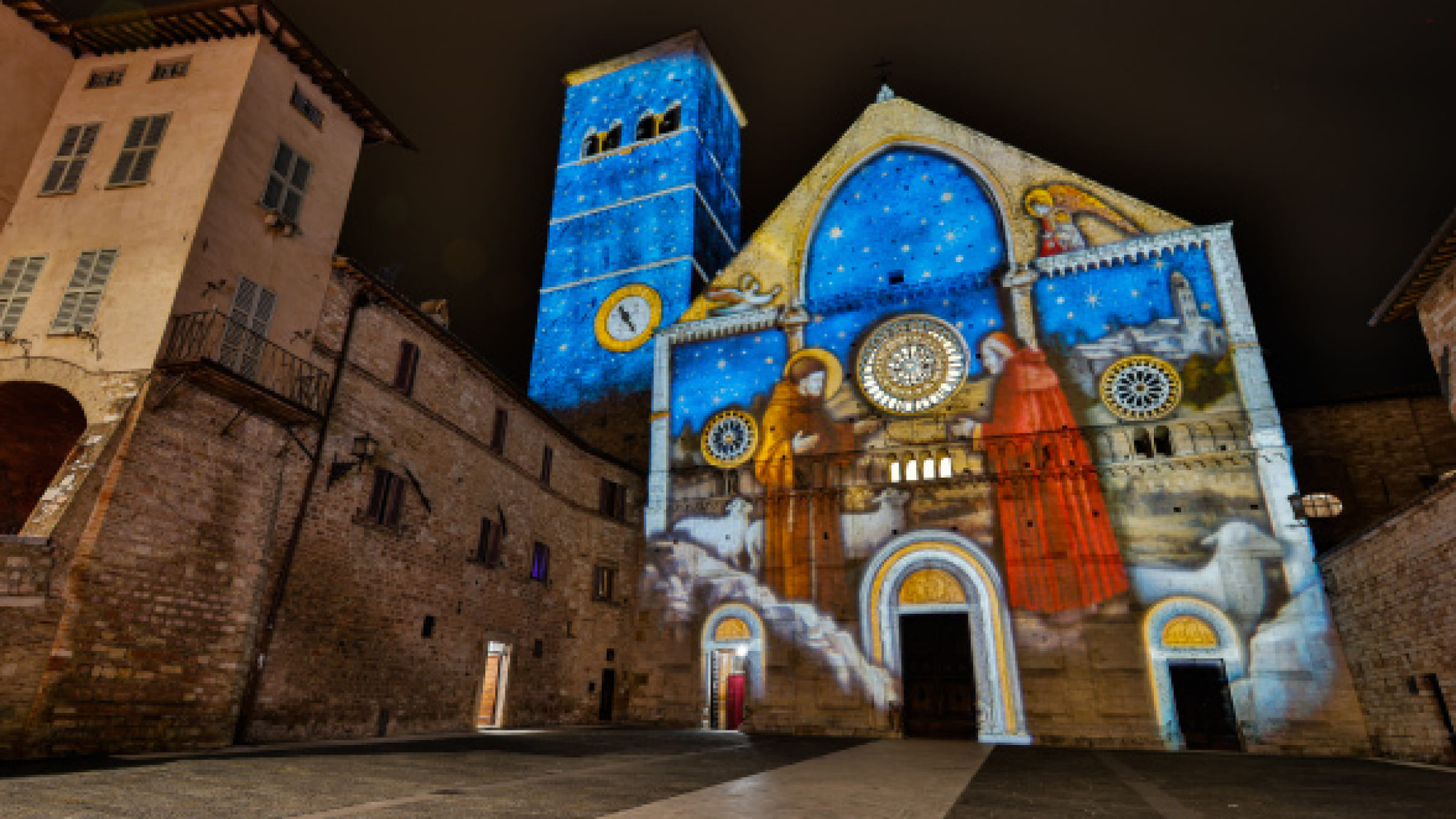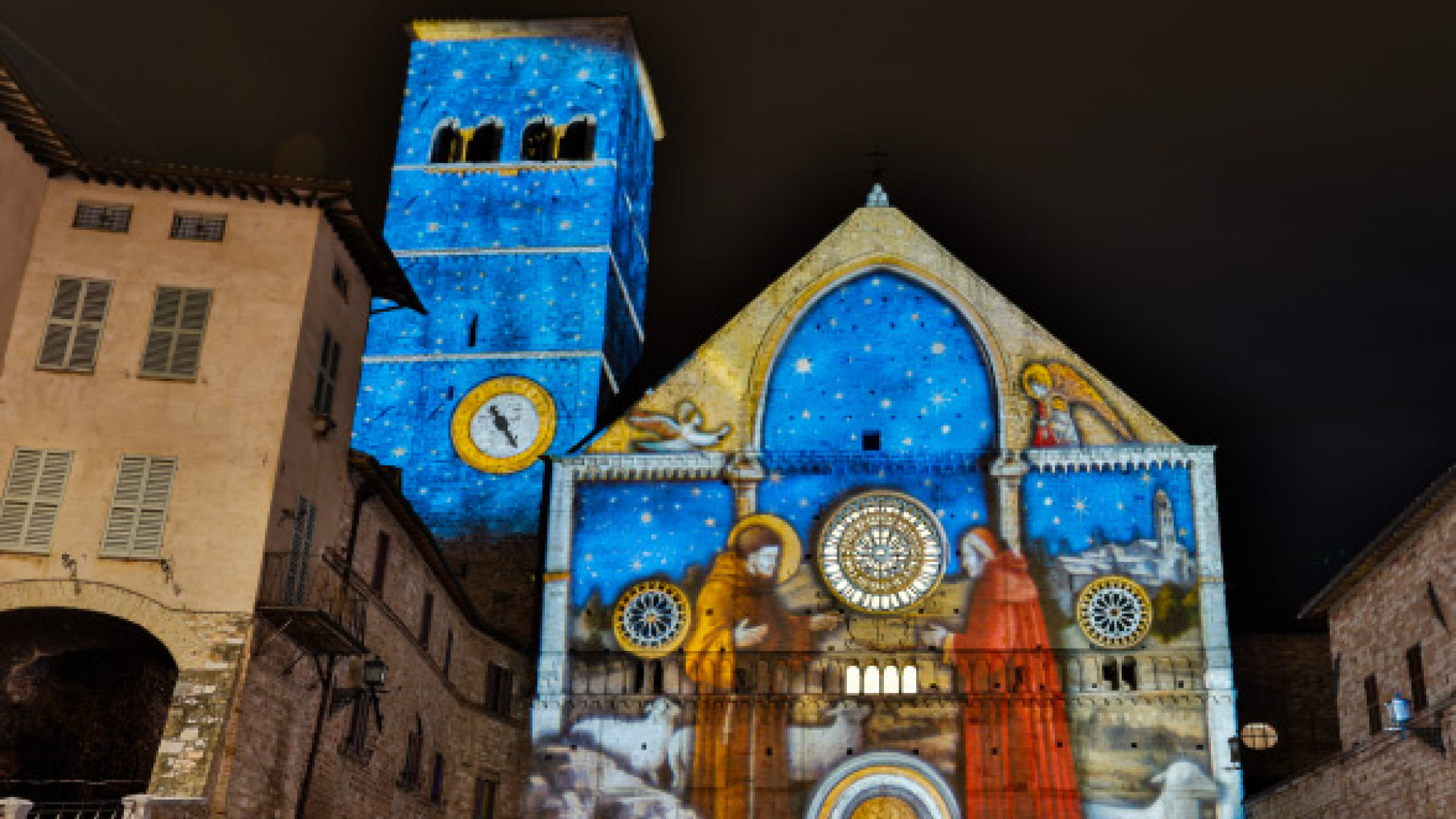 L’itinerario luminoso inizia con la Basilica di Santa Chiara, dove la Scena 1 si illumina raffigurando San Francesco che ottiene il permesso di celebrare la natività da Papa Onorio III. Proseguendo verso la Cattedrale di San Rufino, la Scena 2 mostra San Francesco con il suo amico Giovanni, a cui chiede di aiutarlo a rappresentare il Natale di Gesù a Greccio.