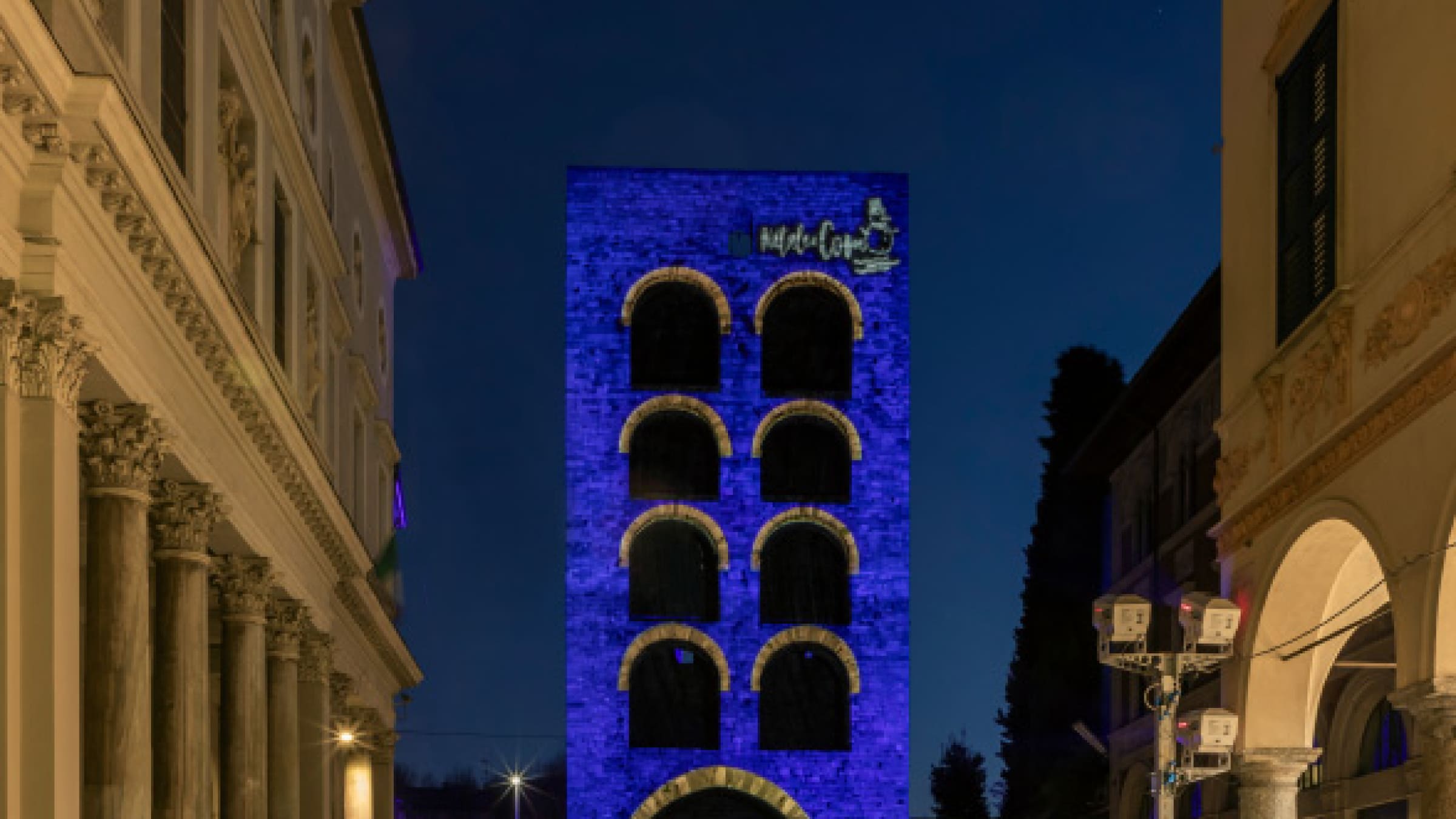 La Porta Torre, emblema della città e testimone di secoli di storia, si illumina di una radiosa luce blu, arricchita da una cascata di piccole stelle luminose. Questa scenografia crea un effetto visivo suggestivo, rendendo la storica struttura un punto di attrazione per i cittadini e i visitatori.