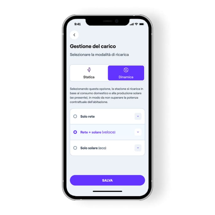 - Rete + solare (veloce): Ricarica più veloce sommando la potenza prelevata da rete a quella prodotta dai pannelli fotovoltaici non utilizzata da altri carichi domestici.