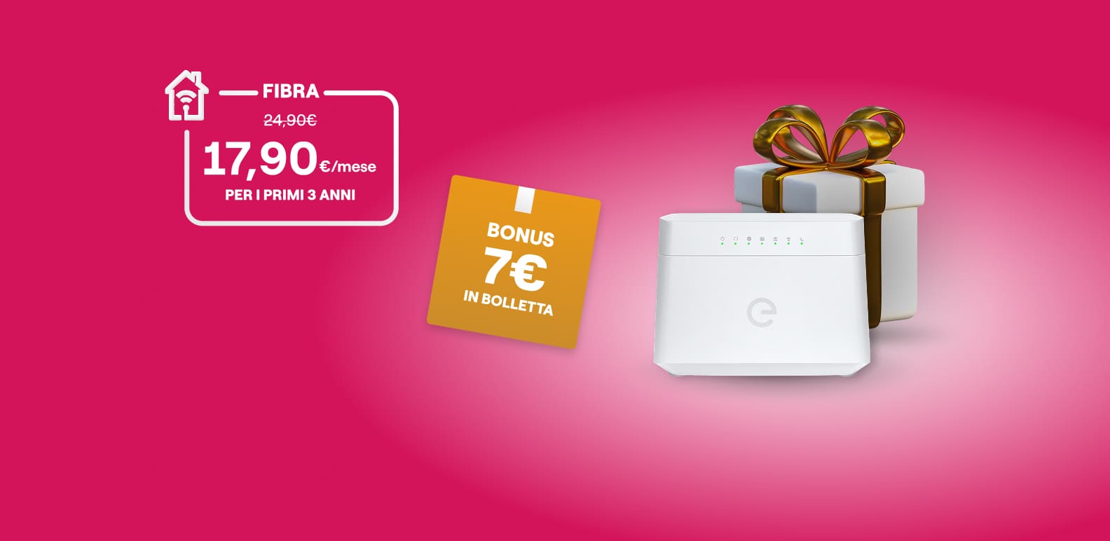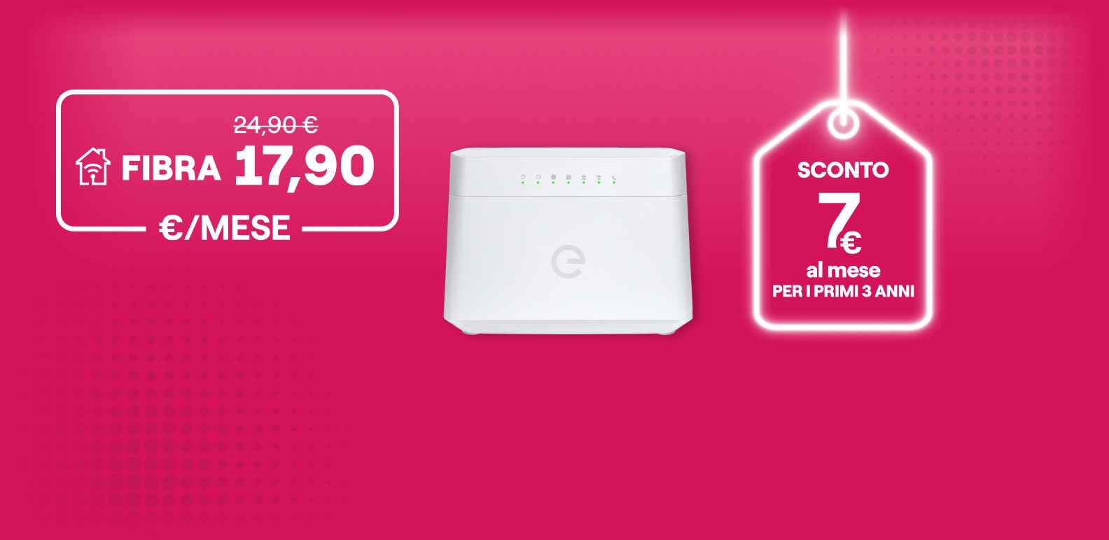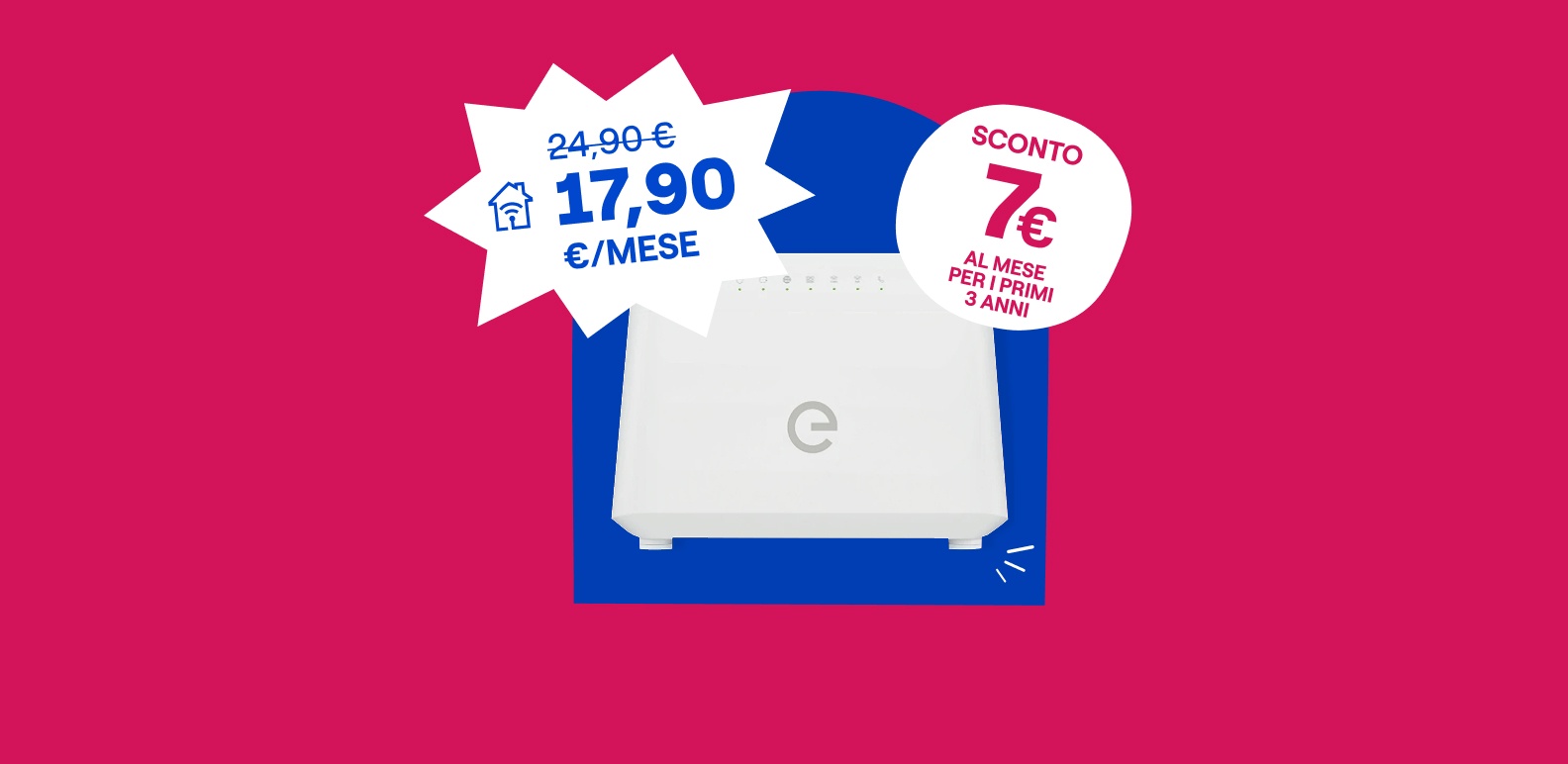 Per questi clienti il canone base di 24,90€/mese sarà scontato a 17,90€/mese per i primi 36 mesi. Addebito su conto corrente o carta di pagamento obbligatorio. Il costo di attivazione per adesioni tramite canali diversi dal web è pari a 29,90€. È previsto un costo di disattivazione pari a 17,90€ in caso di recesso entro i primi 24 mesi. Il recesso dal contratto di fornitura di energia elettrica e/o gas comporta la perdita o la rimodulazione del diritto allo sconto a far data dal primo giorno del mese successivo a quello d’avvenuto recesso e determina la modifica dei termini di validità dello sconto e del primo impegno contrattuale dell’offerta associata. In particolare, in caso di recesso dalla fornitura luce o gas il canone sarà rimodulato in 21,90€/mese. L'offerta è soggetta a condizioni e limitazioni, verifica la copertura per scoprire la fibra FTTH e mista rame FTTC da cui è raggiunta la tua abitazione. La velocità di navigazione indicata (FTTH) è da considerarsi come massima. I prezzi sono IVA inclusa. Per aderire ad un’offerta senza modem incluso consulta le FAQ.