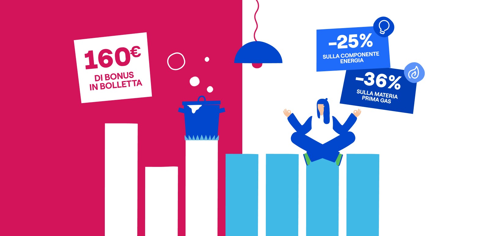 Il bonus di 160€ nelle bollette è erogato in quattro tranches direttamente nella prima, settima, tredicesima e diciannovesima bolletta. Condizioni economiche valide fino al 11/02/2026, salvo proroghe. Altre componenti di spesa come da CTE.
