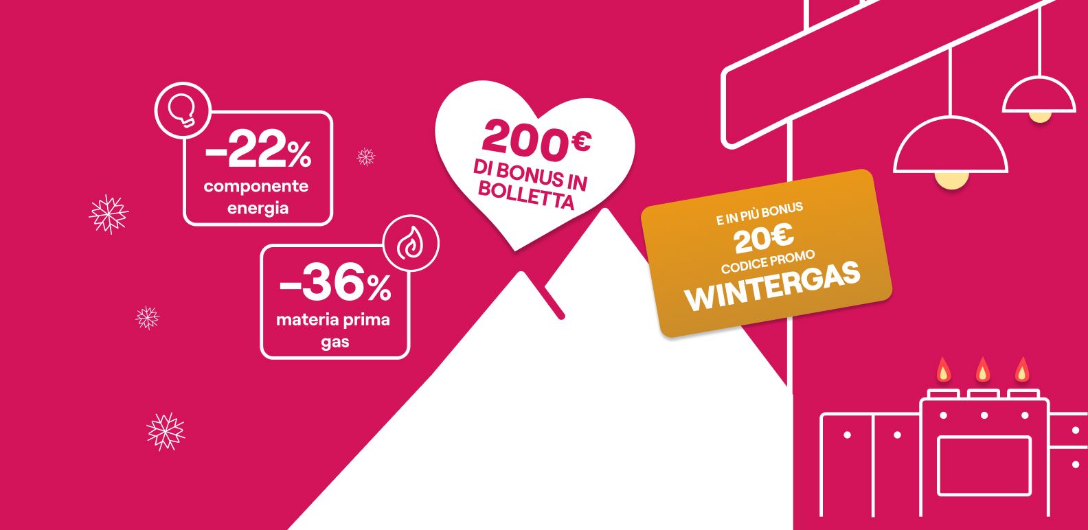 Bonus WINTERGAS: sottoscrivendo la presente offerta inserendo il codice promo WINTERGAS valido dal 12/02/2026 al 04/03/2026, verrà riconosciuto nelle prime 10 bollette mensili un bonus di 2€, a detrazione dell’importo totale fatturato in bolletta.