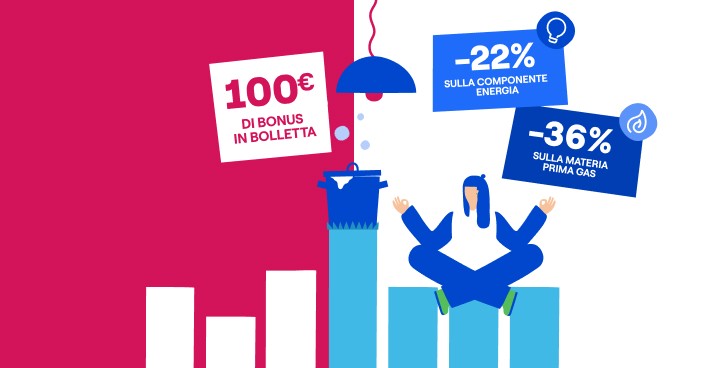 Il bonus di 100€ (40€ nelle bollette luce e 60€ nelle bollette gas) è erogato in quattro tranches direttamente nella prima, settima, tredicesima e diciannovesima bolletta. Condizioni economiche valide fino al 31/03/2026, salvo proroghe. Altre componenti di spesa come da CTE.